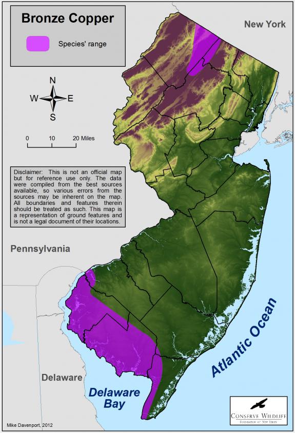Since the 1940s only a few individuals have been observed. Bronze coppers were once common and were scattered throughout the state, primarily in the northern regions of New Jersey. Habitat loss from the draining of wetlands and the use of herbicides and insecticides has seriously effected the population in New Jersey. This butterfly was listed as endangered in 2001. Wetland protection is key for long-term success of this species in New Jersey.