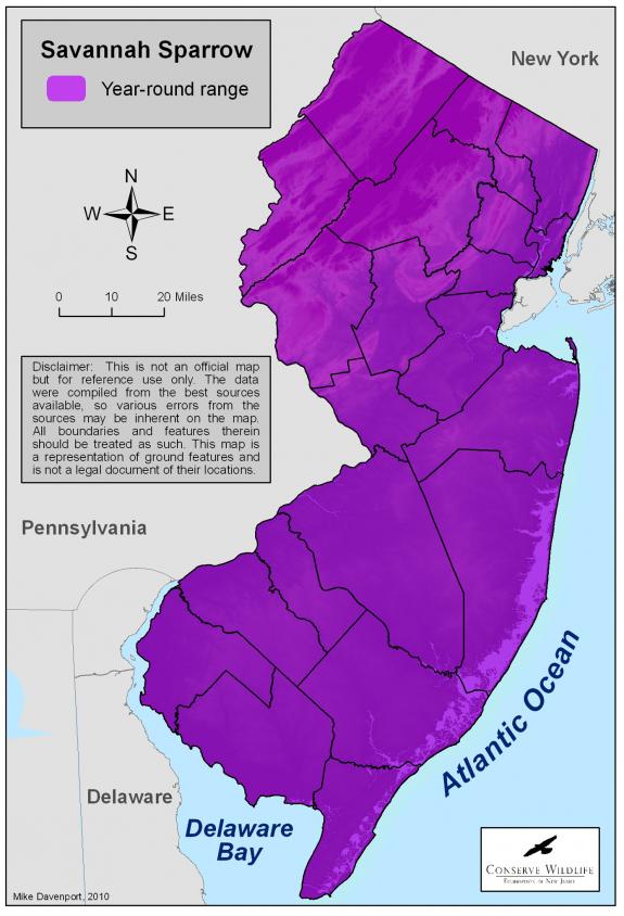 Savannah sparrows breed in the Ridge and Valley and Highlands regions of northern New Jersey and in the inner coastal plain of southwestern New Jersey.